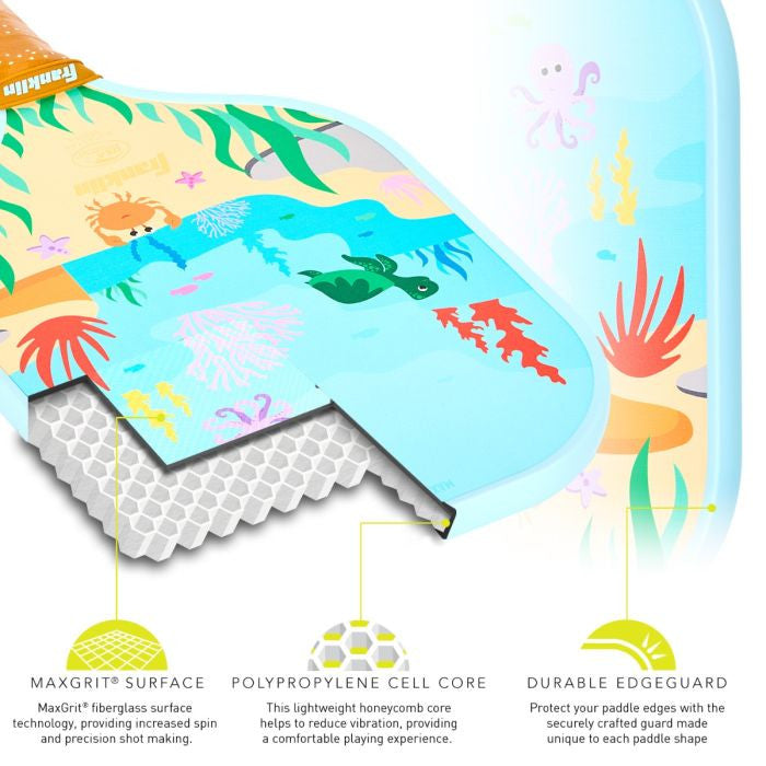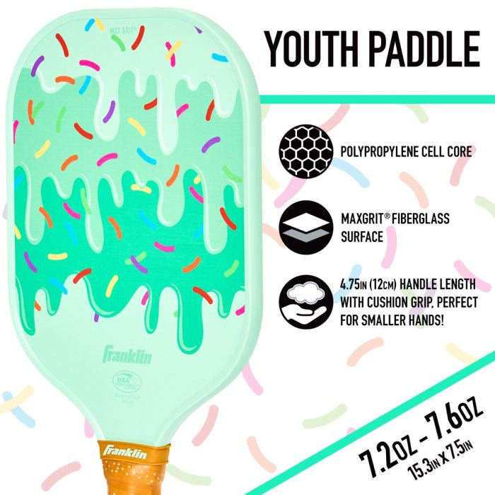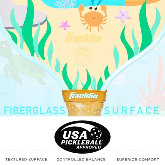 These paddles are also designed to be lightweight between 7.2 - 7.6 ounces to make them easier for kids to swing and handle. Plus, kids will love the fun, playful design and standing out on the court. Our Junior paddles meet USA Pickleball standards and have been approved for tournament and competitive play. Franklin Sports' Junior Pickleball Paddles are great for new and beginner players looking to try out a game of pickleball, so grab yours and get playing today! SPECS: Paddle 15.3 x 7.5in, Handle 4.75in, Max Grit Fiberglass Surface.
