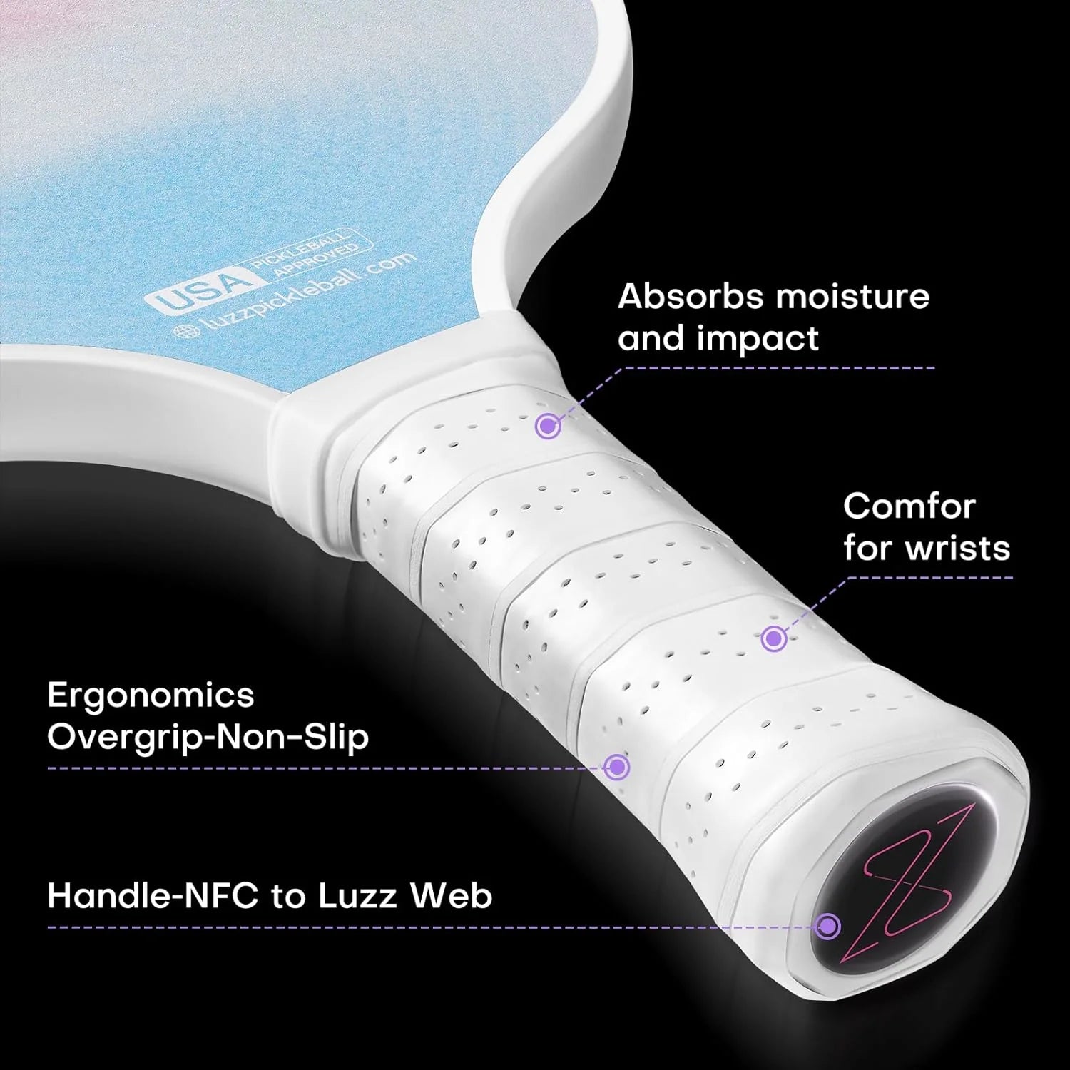 Our 5" x 4.8" tennis-style handle features moisture-wicking technology and advanced contouring for complete control. The cushioned perforated surface prevents slippage during intense matches.