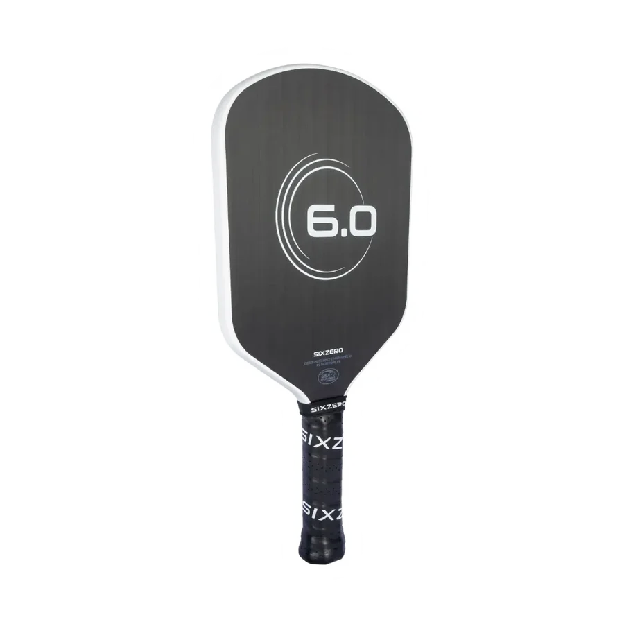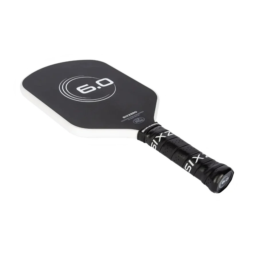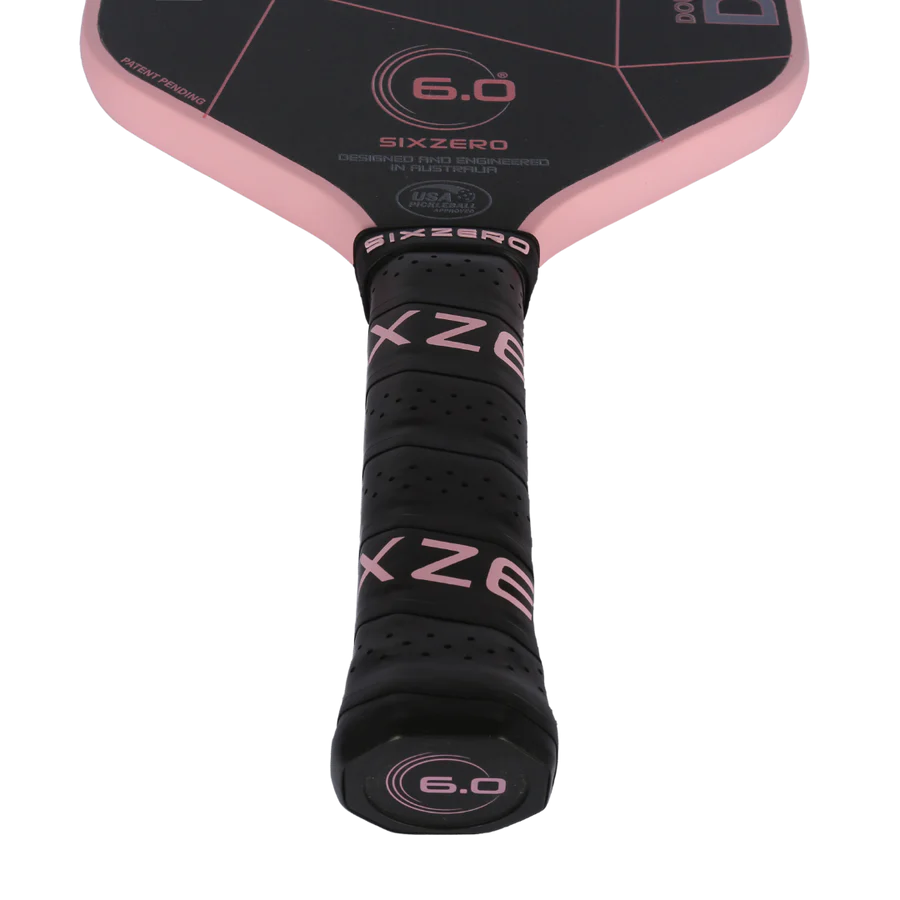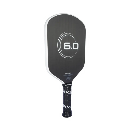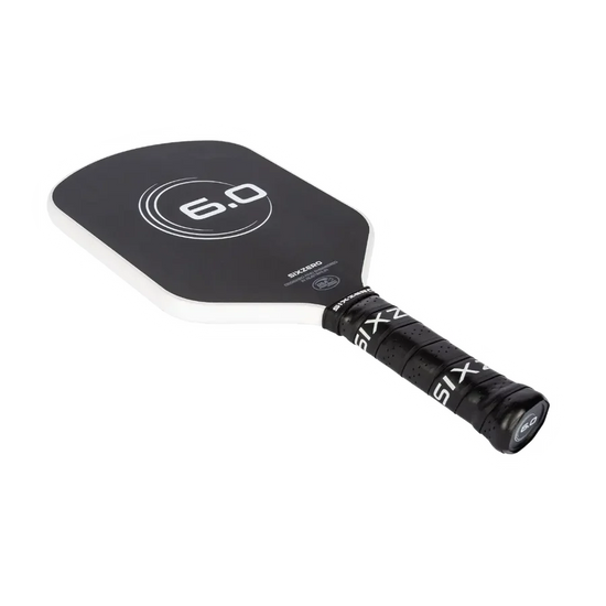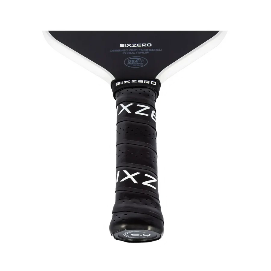 The elongated 3D carbon thermoformed handle is tailored to reduce vibration and increase comfort. The carbon face and fusion edge technology span the entire length of the handle, melded under intense heat and pressure to ensure strength and durability. The ergonomic design is perfected with a premium custom Six Zero perforated leather grip, making it suitable for all hand sizes and particularly beneficial for players with a double backhand.