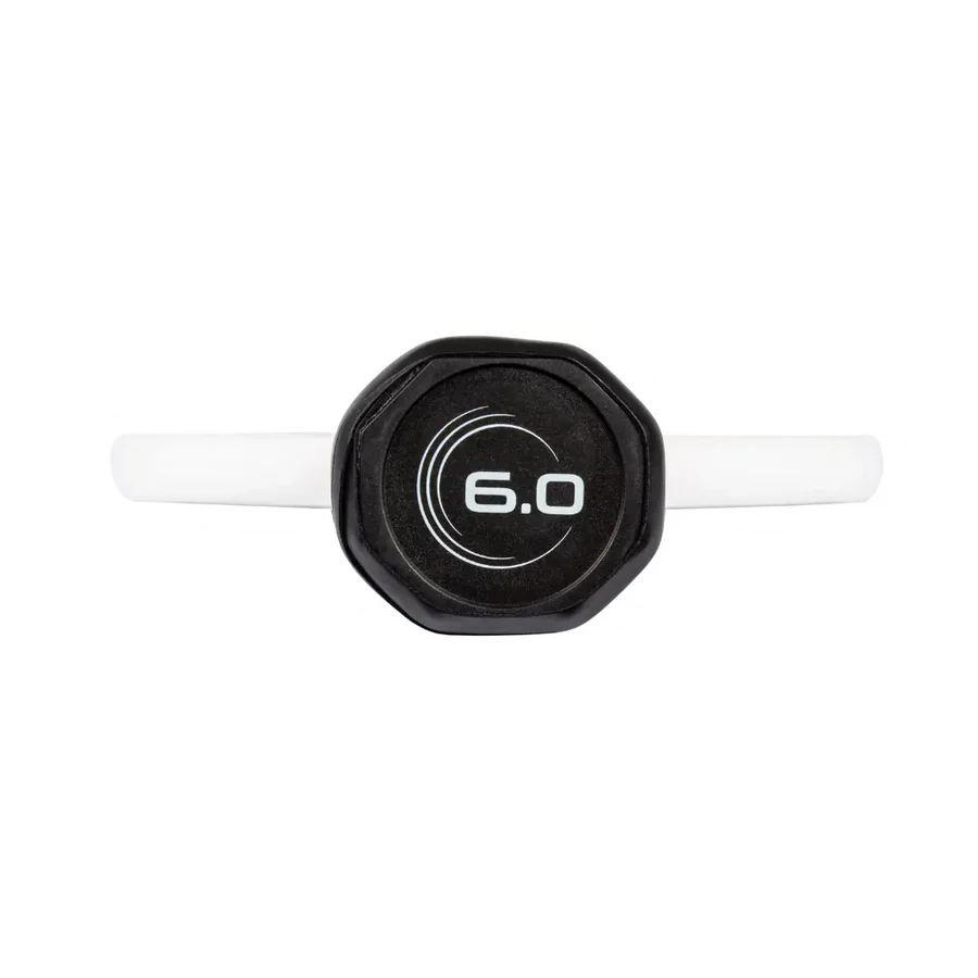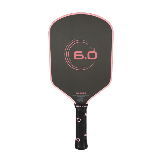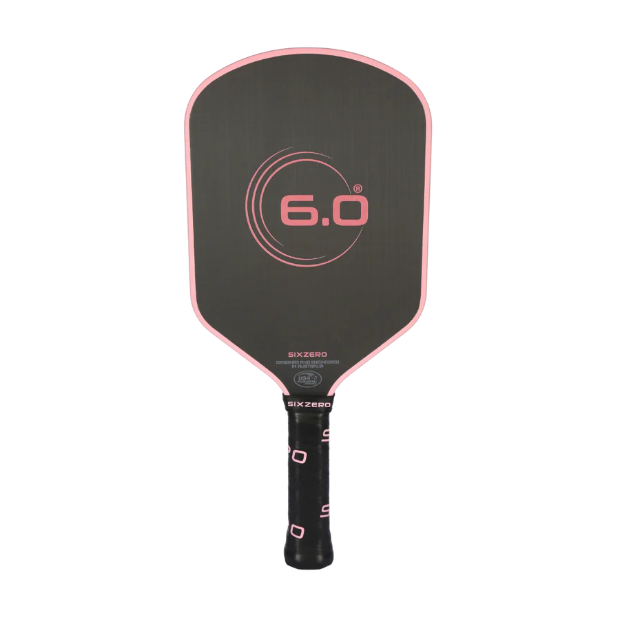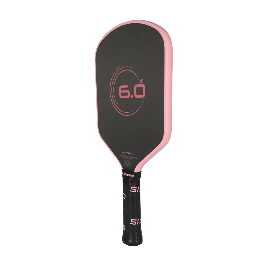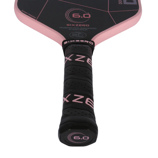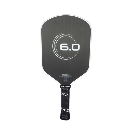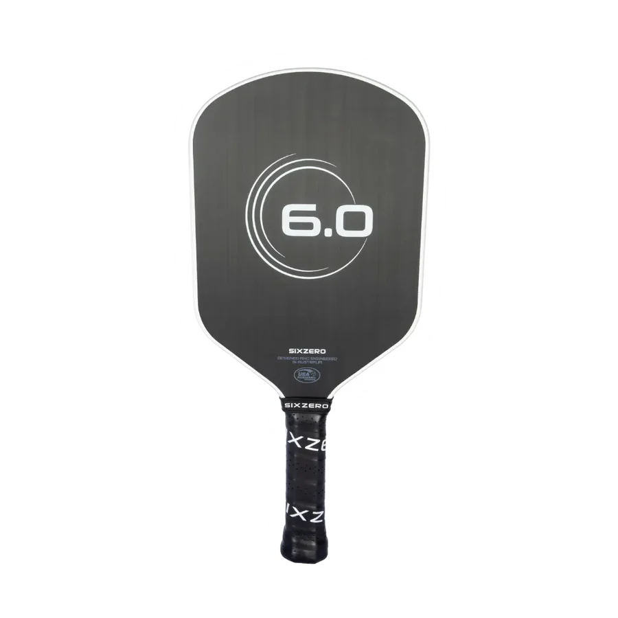 The elongated 3D carbon thermoformed handle is tailored to reduce vibration and increase comfort. The carbon face and fusion edge technology span the entire length of the handle, melded under intense heat and pressure to ensure strength and durability. The ergonomic design is perfected with a premium custom Six Zero perforated leather grip, making it suitable for all hand sizes and particularly beneficial for players with a double backhand.